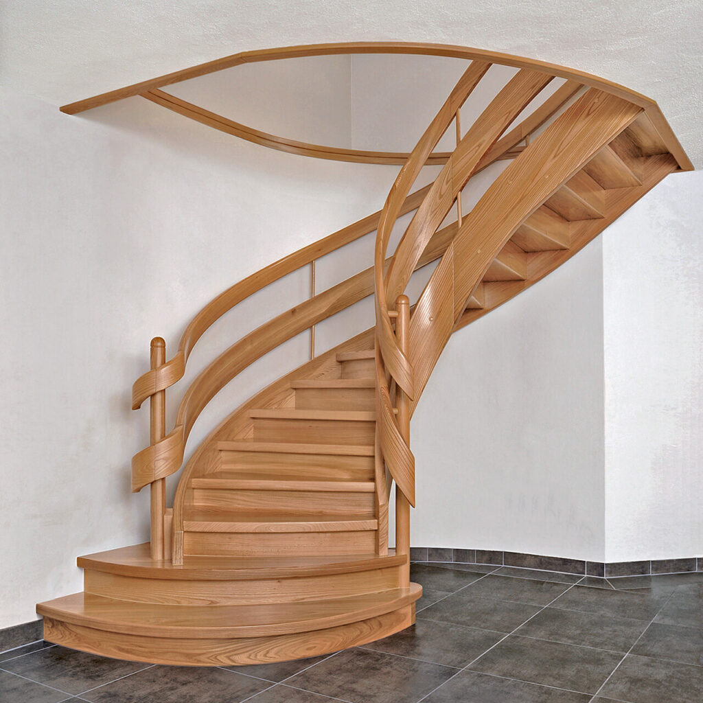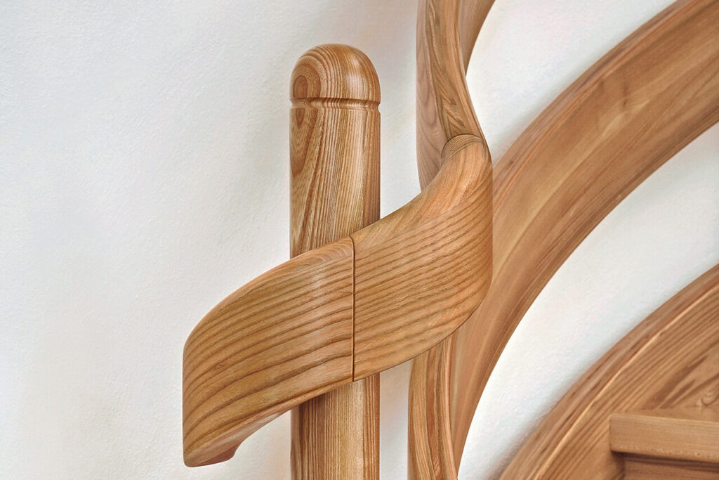 In unserer Manufaktur haben wir bereits zahlreiche Treppenpfosten in verschiedenen Stilen und Techniken realisiert. Ein besonderes Beispiel ist ein gebogener Treppenhandlauf, der eine besonders anspruchsvolle Arbeit darstellte. Der Handlauf windet sich elegant um die Treppenpfosten und verleiht der Treppe durch diese handwerkliche Meisterleistung eine außergewöhnliche Ästhetik.