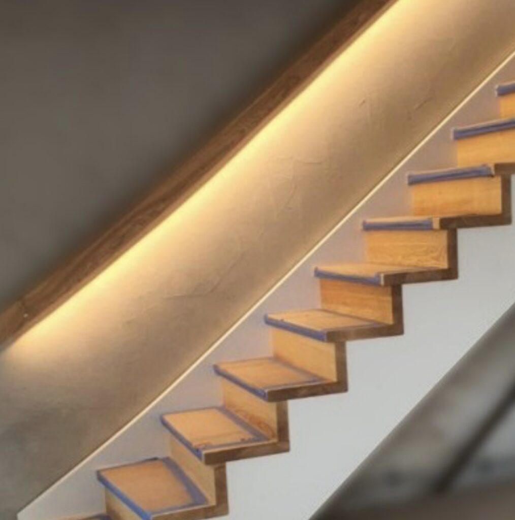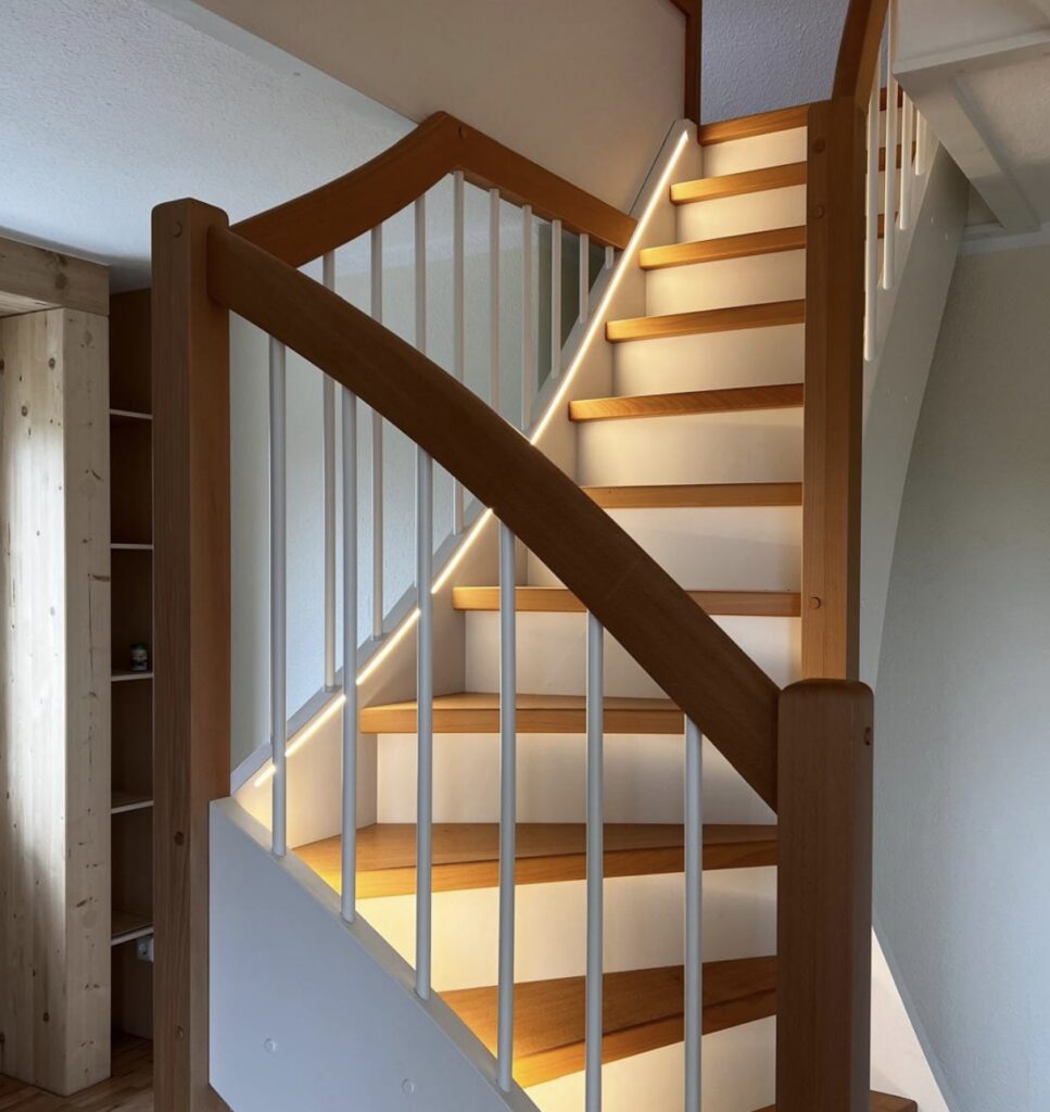 LED-Streifen sind eine der beliebtesten Optionen für die Treppenbeleuchtung. Sie lassen sich flexibel unter den Stufen, an den Wangen oder im Handlauf integrieren. Sie sorgen für eine indirekte Beleuchtung, die nicht blendet, und schaffen gleichzeitig eine moderne, schwebende Optik.