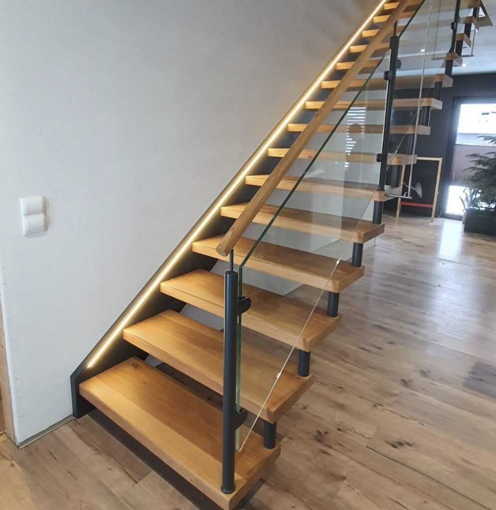 Eine in den Handlauf integrierte Beleuchtung sorgt für eine gleichmäßige Ausleuchtung der Stufen und gibt zusätzliche Sicherheit. Sie eignet sich besonders für dunklere Treppenhäuser oder als stilvolles Designelement bei offenen Treppen.