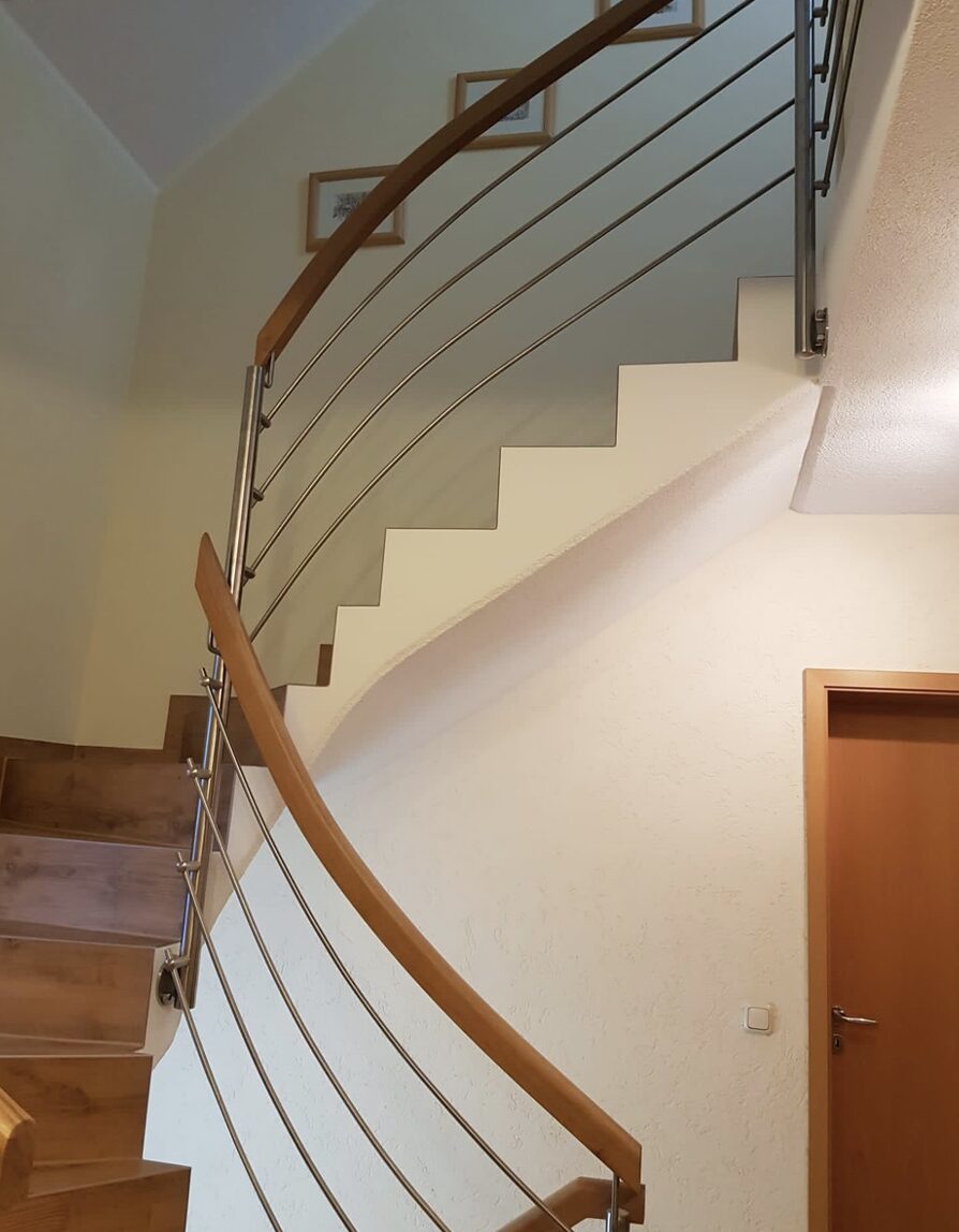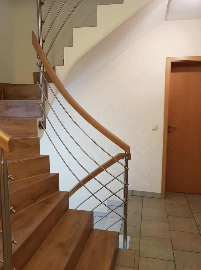 Zusammen mit unserem Kunden erstellten wir die ersten Entwürfe für das neue Geländer und die Stufenbeläge. Die Treppe sollte im Gesamten eine Leichtigkeit versprühen und dabei trotzdem modern aussehen. Als geeignete Lösung entschieden wir uns deshalb für ein Relinggeländer aus Edelstahl mit einem Holzhandlauf in Eiche. Passend dazu wählten wir auch die neuen Stufenbeläge aus Eichenholz.