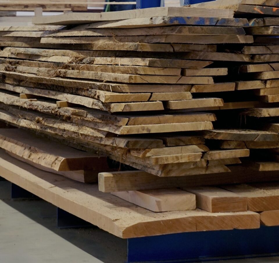 Nach der Materialauswahl erfolgt der erste Schritt in der Produktion: Große Bretter und Bohlen werden angeliefert und genau begutachtet. Jedes Stück wird sorgfältig geprüft, zugeschnitten und für die Weiterverarbeitung vorbereitet. Hier entscheidet sich bereits, welche Holzpartien später für Stufen, Wangen oder Geländer verwendet werden.