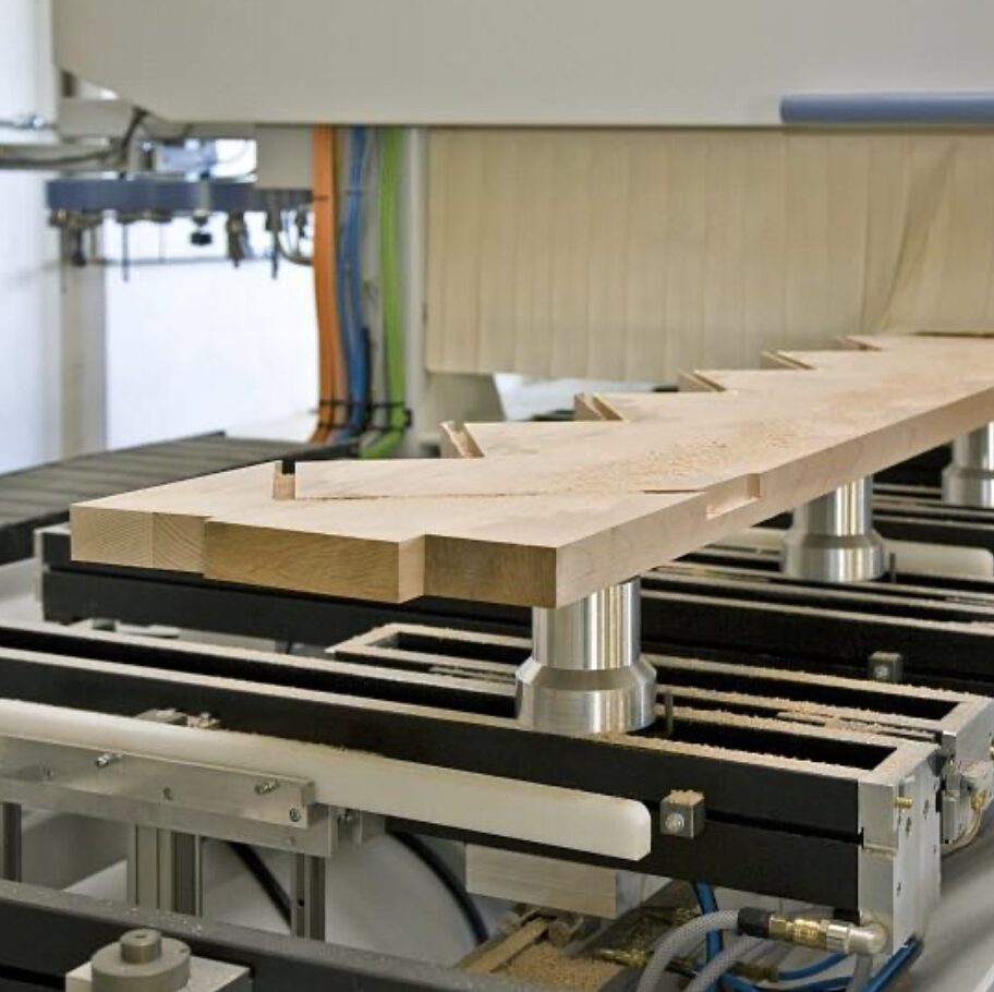 In der nächsten Phase kommen modernste Maschinen zum Einsatz. Mit CNC-Technologie werden die zugeschnittenen Holzelemente millimetergenau bearbeitet. Fräsungen, Zapfenverbindungen und Bohrungen werden präzise ausgeführt, um eine perfekte Passgenauigkeit zu gewährleisten. Doch trotz dieser Technik bleibt Handarbeit ein wesentlicher Bestandteil unseres Herstellungsprozesses.