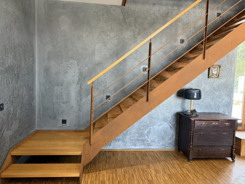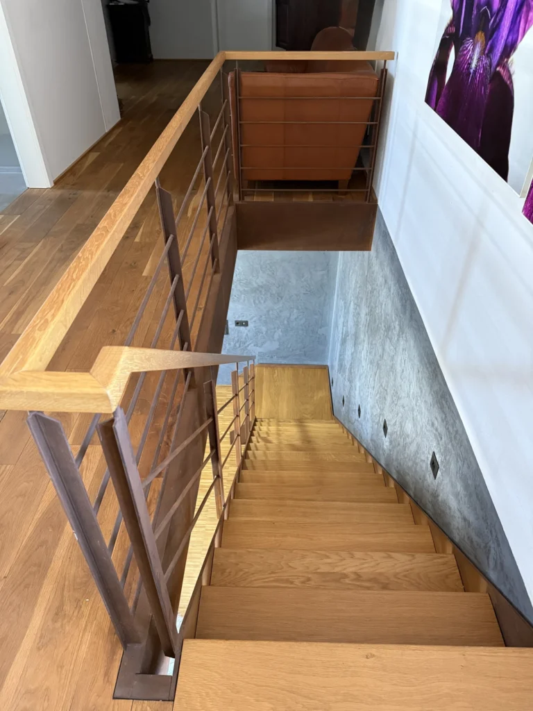 Diese moderne Design-Metalltreppe kombiniert zeitlose Eleganz mit funktionaler Raffinesse. Die massiven Eichenstufen harmonieren perfekt mit dem schlanken Metallstabgeländer und den deckend lackierten Wangen. Ein integrierter Raumteiler verleiht der Konstruktion zusätzliche Struktur und schafft fließende Übergänge zwischen den Wohnbereichen. Durch die besondere verschachtelte Etagenbauweise des Hauses waren präzise Entwurfsabstimmungen, millimetergenaues Aufmaß und eine passgenaue Metallbauplanung entscheidend für die gelungene Umsetzung. Das Ergebnis ist eine hochwertige, langlebige Treppenlösung, die modernes Design und handwerkliche Präzision vereint.