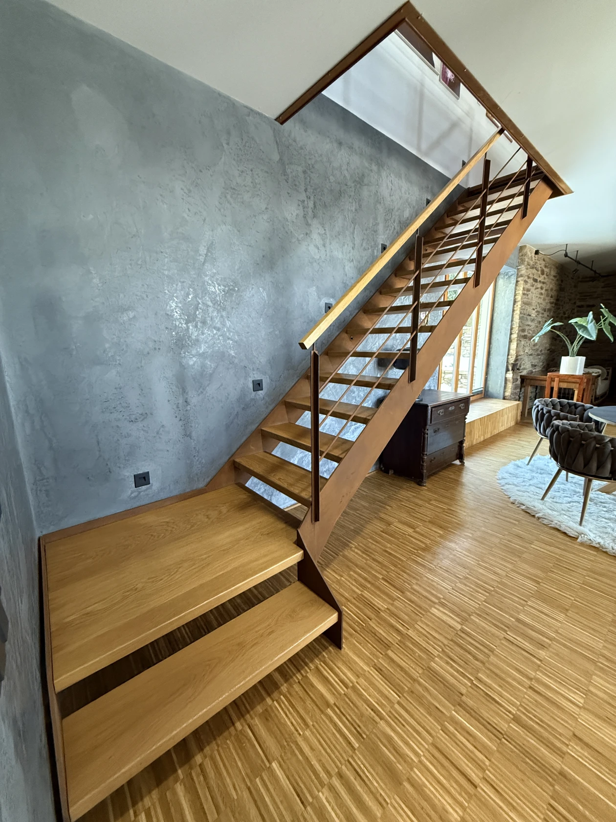 Moderne Design – Metalltreppe mit Eichenstufen und Raumteiler