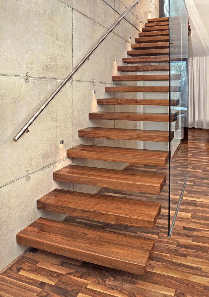 Moderne Projekte nutzen häufig schwebende Treppen oder Treppen mit Glasgeländern, um den Raum weiter zu öffnen und das Design des Hauses zu unterstreichen.