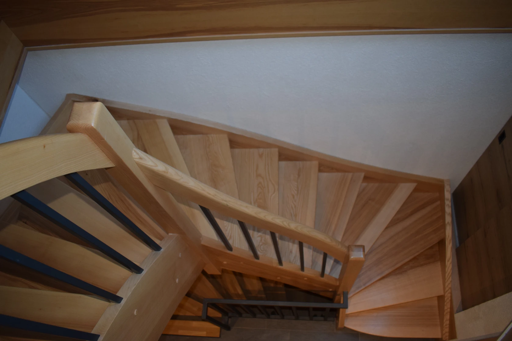 Eine moderne Holztreppe mit schwarzem Metallgeländer in einem gut beleuchteten Innenraum. An den Wänden hängen kleine gerahmte Kunstwerke, und auf dem oberen Treppenabsatz befindet sich eine gemusterte Wand. Die Treppe führt nach oben und mündet in einen Treppenabsatz.