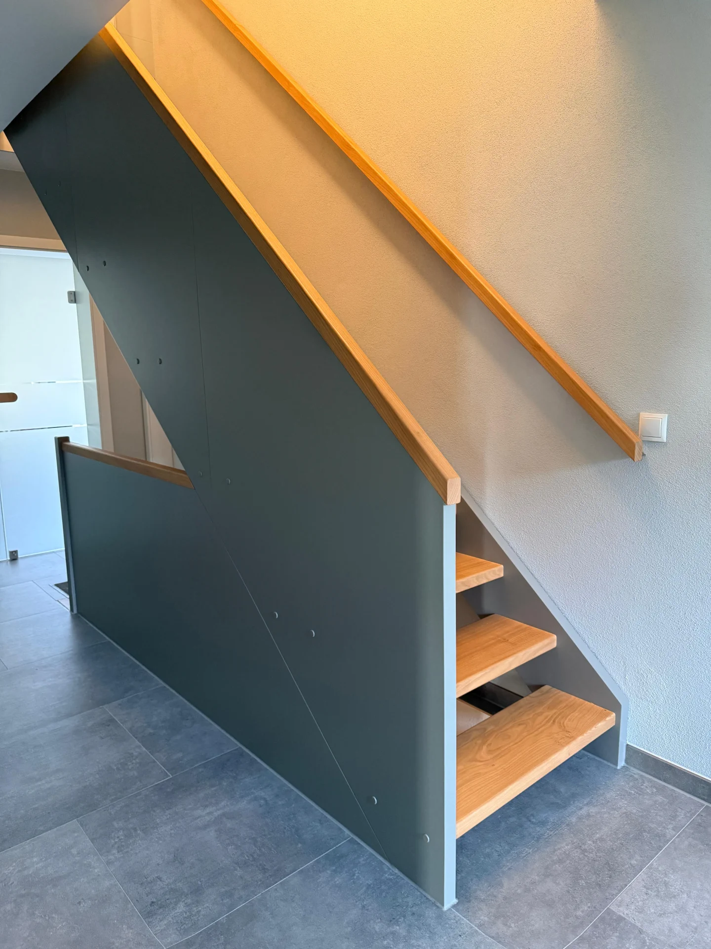Diese Designtreppe aus geölter Roteiche wurde als präzise Antwort auf eine baulich begrenzte Situation mit kleiner Deckenöffnung entwickelt. Ziel der Planung war es, trotz der eingeschränkten Raumverhältnisse eine komfortable und gestalterisch überzeugende Verbindung zwischen den Ebenen zu schaffen. Durch eine optimierte Treppengeometrie konnte ein angenehmer Steigungsverlauf realisiert werden, der Sicherheit und Begehkomfort gewährleistet. Die warm geölte Oberfläche der Roteiche bringt die natürliche Maserung des Holzes zur Geltung und verleiht dem Raum eine hochwertige, ruhige Ausstrahlung. Ein Plattenbrüstungsgeländer unterstützt die klare Formensprache und sorgt zugleich für eine zurückhaltende Abschirmung. Die Treppe wirkt als architektonisches Element, das Funktion und Gestaltung in Einklang bringt und den vorhandenen Raum effizient und elegant nutzt.