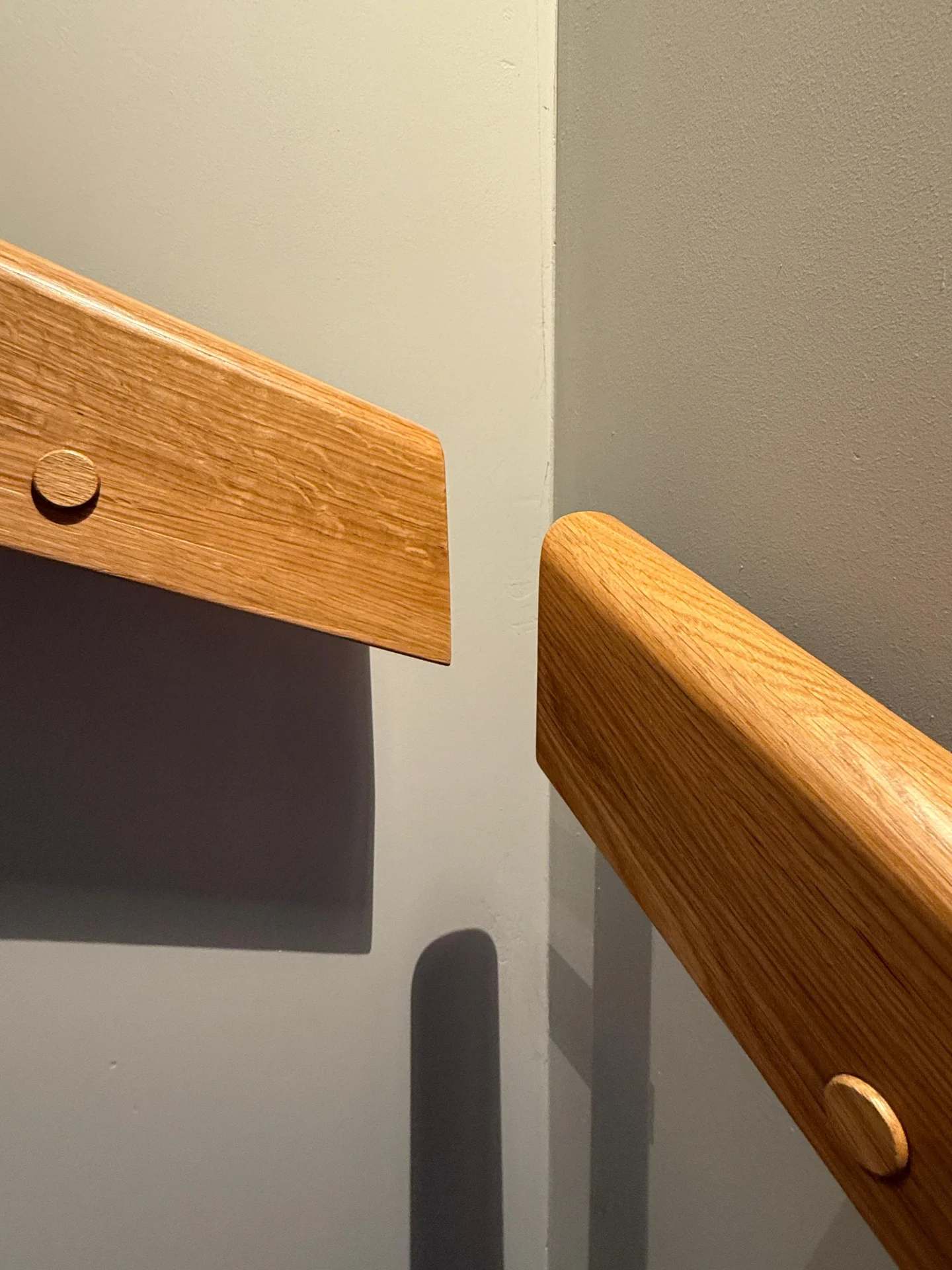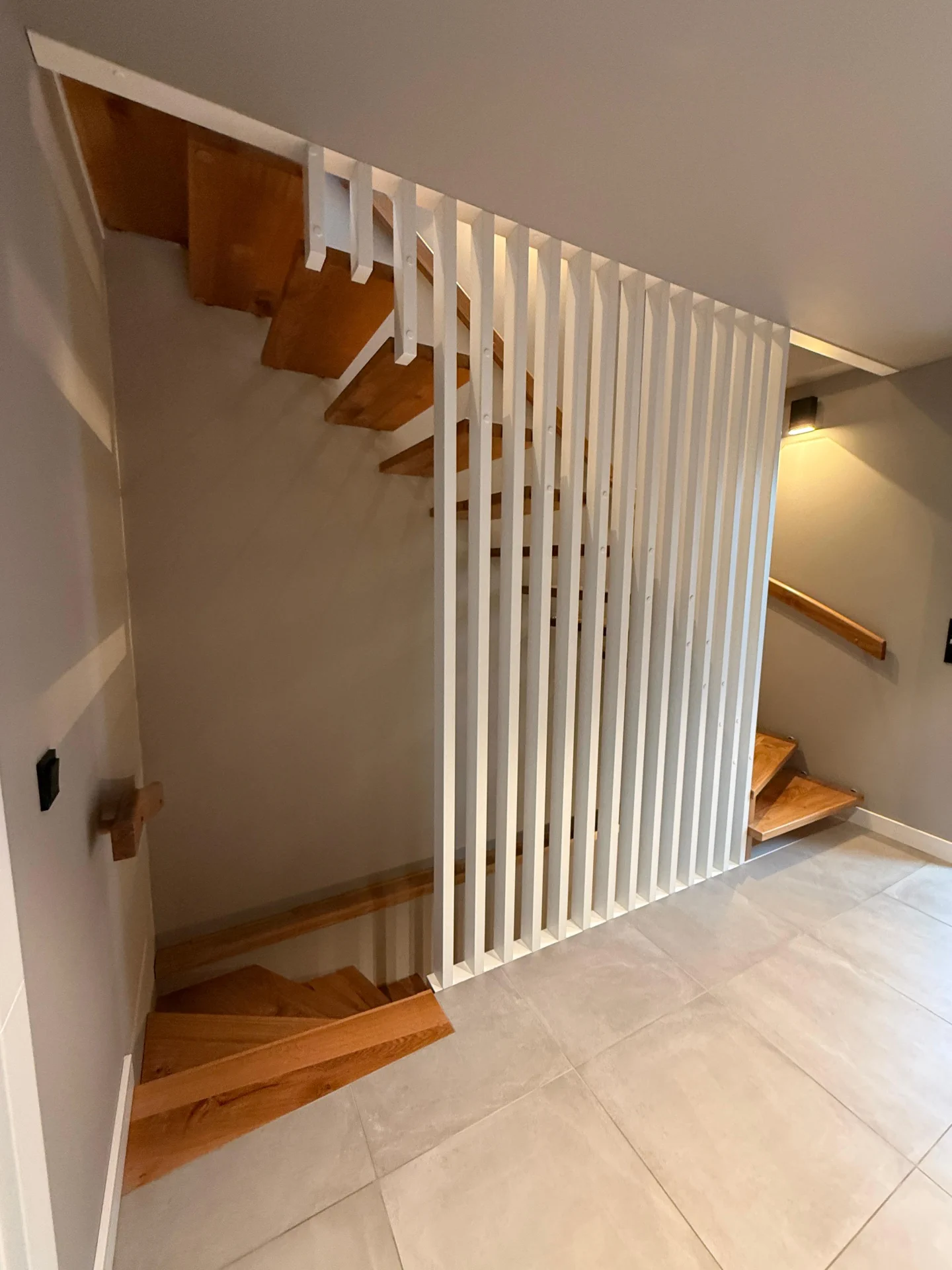 Diese Designtreppe aus Eiche verbindet handwerkliche Präzision mit einer klaren architektonischen Aussage. Die offen gestalteten Holzstufen verleihen der Konstruktion eine leichte, beinahe schwebende Wirkung und lassen den Treppenraum großzügig erscheinen. Ein prägendes Element ist das vertikale Spaliergeländer, das nicht nur als Absturzsicherung dient, sondern zugleich eine strukturierende Raumtrennung übernimmt. Es schafft Sichtbezüge zwischen den Ebenen, ohne den Raum vollständig abzuschließen, und unterstützt damit eine offene Wohnatmosphäre. In der Planung lag der Fokus auf der exakten Abstimmung von Treppenlauf, Geländergeometrie und Wandverläufen, um eine harmonische Linienführung zu erreichen. Die natürliche Oberfläche der Eiche unterstreicht den wohnlichen Charakter und sorgt für eine warme Materialwirkung. So entsteht eine Treppenlösung, die Funktion, Design und Raumwirkung zu einem stimmigen Gesamtkonzept vereint.
