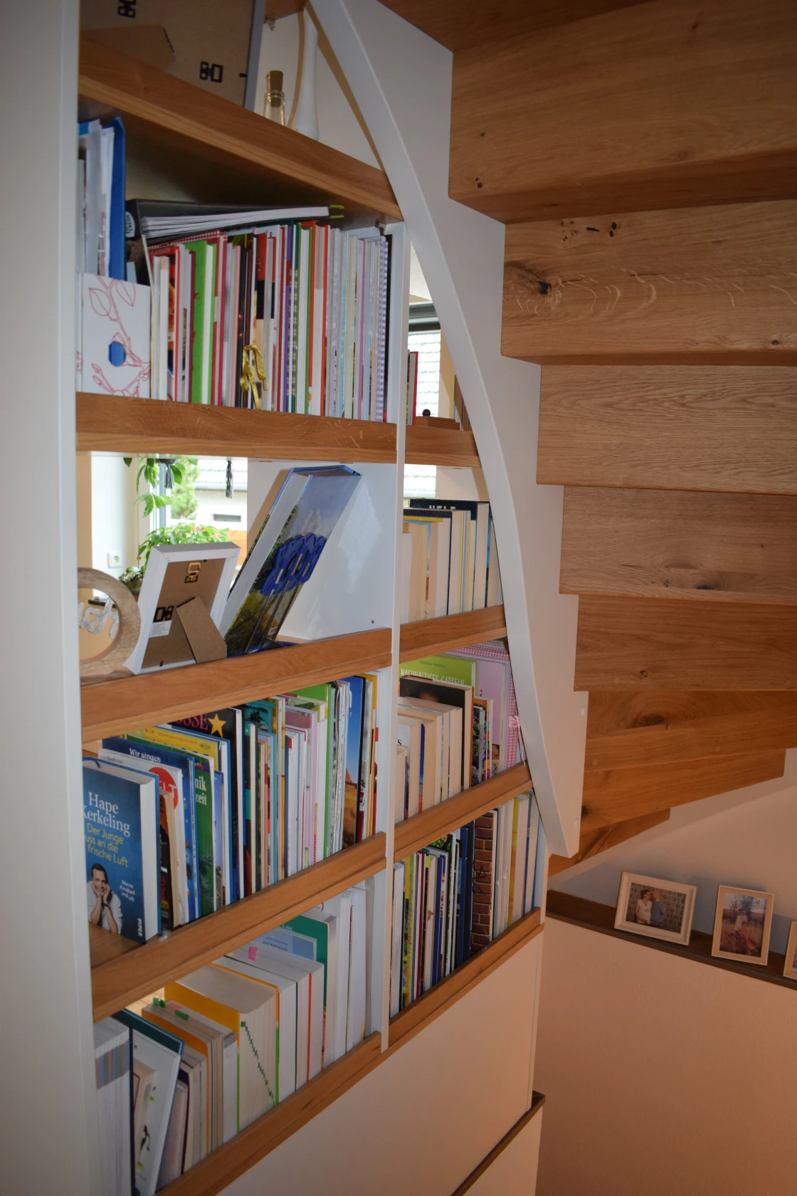 Geschlossene Regaltreppe aus Eiche als verbindendes Raumelement