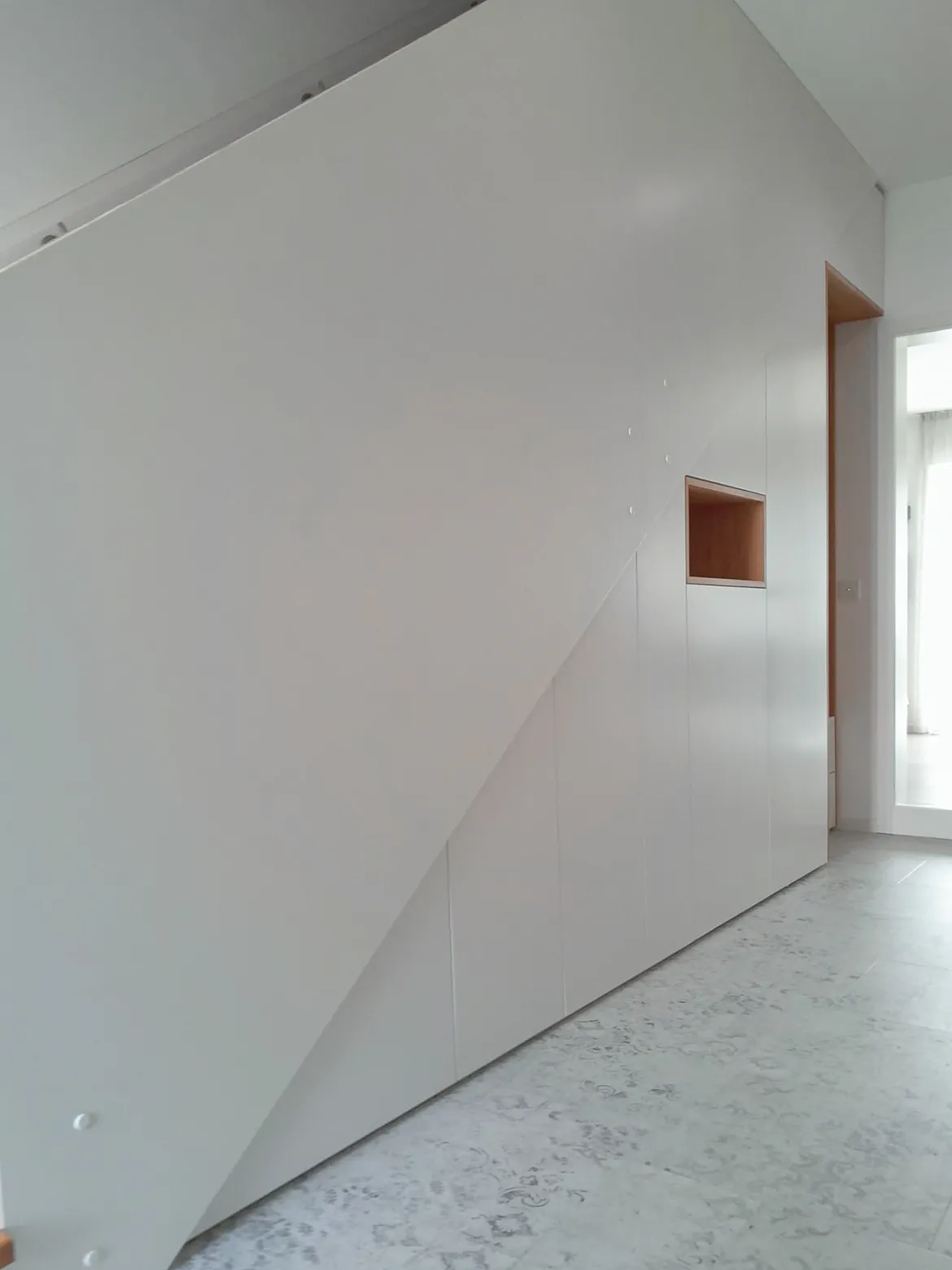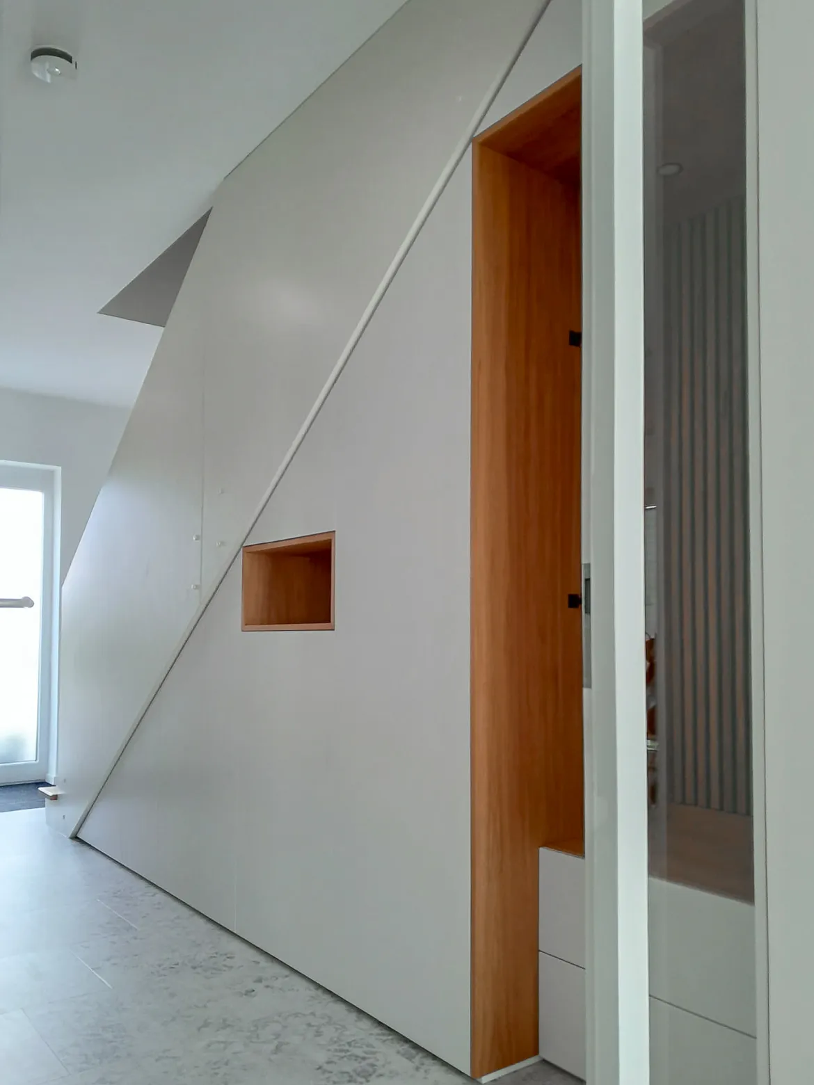 Bei diesem Projekt stand die optimale Nutzung des vorhandenen Raumes im Vordergrund. Die Kombination aus maßgefertigten Stauraumlösungen und einer modernen Garderobe sorgt für klare Strukturen und ein harmonisches Gesamtbild. Die lackierten Türenfronten und der Korpus aus Dekorplatte fügen sich dezent, aber hochwertig in das Interieur ein.