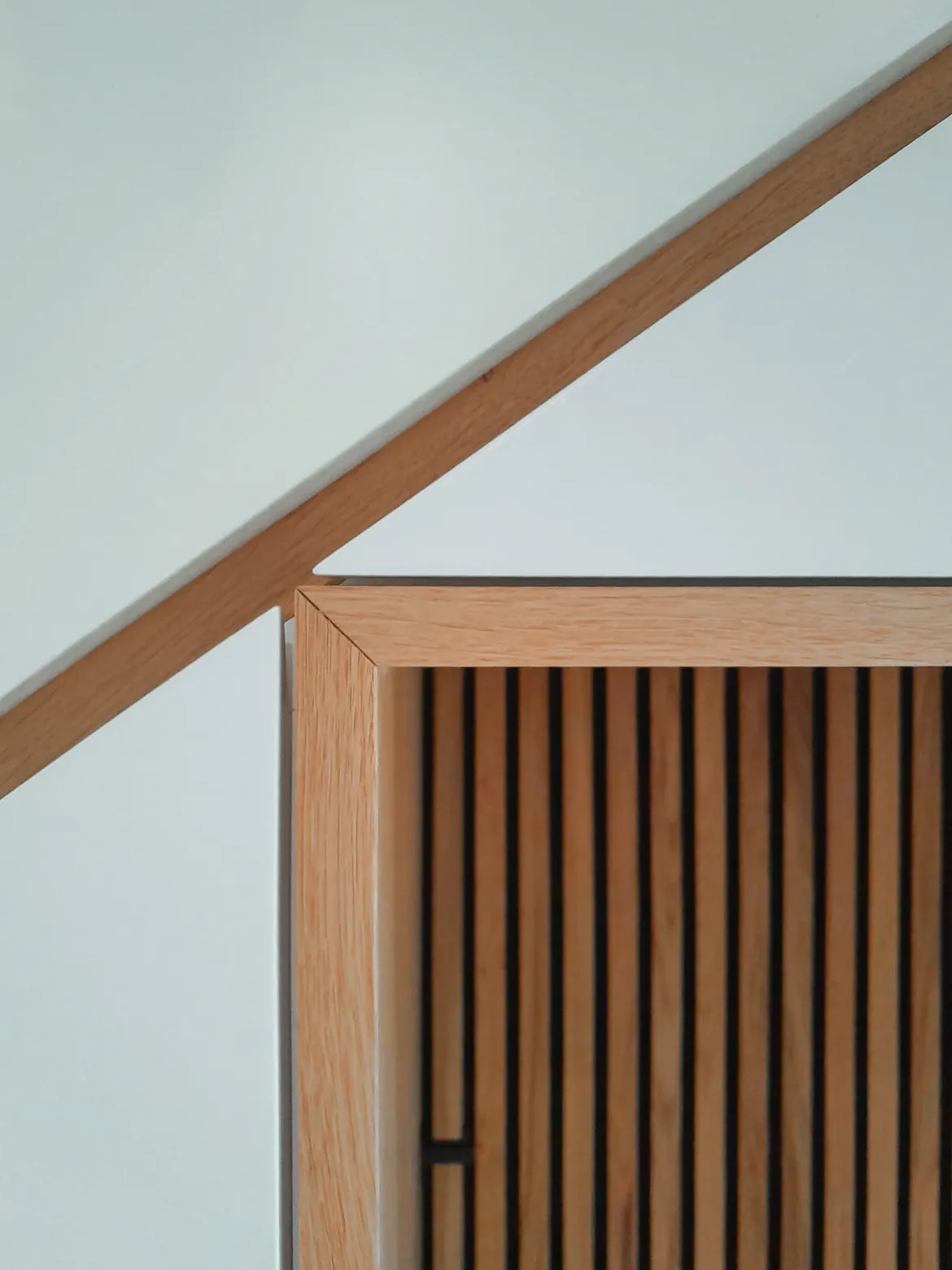 Besonderes Augenmerk lag auf der präzisen Aufteilung der Elemente sowie der perfekten Integration der Garderobe. Durch ein exaktes Aufmaß mit Lasersystem konnte das Fugenbild optimal an die Brüstungswand angepasst werden. Als gestalterisches Highlight ergänzt ein Wandelement in Lamellenoptik den Möbelbau und verleiht dem Raum eine elegante Note.