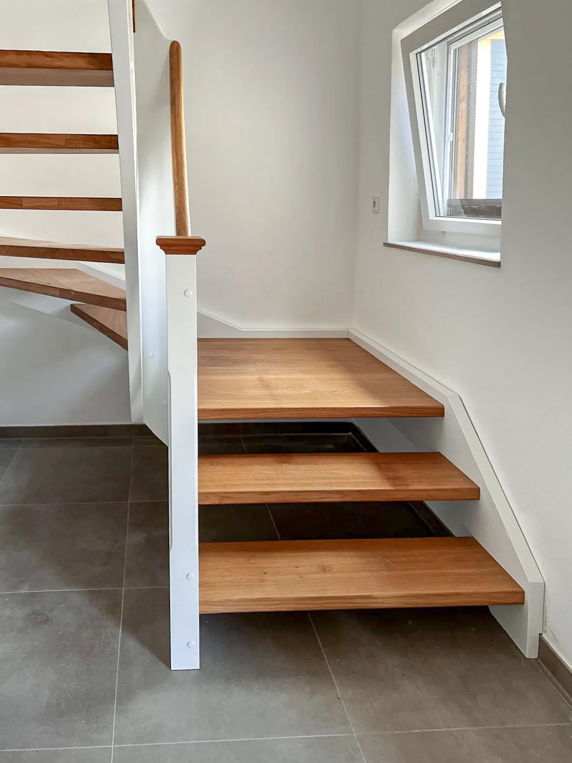 Diese klassische Podesttreppe aus massiver Eiche kombiniert warme Holzstufen mit elegant weiß lackierten Wangen und profilierten Geländerstäben. Die harmonische Verbindung von Holz und Lack verleiht der Treppe eine zeitlose Ausstrahlung, die perfekt in das Wohnambiente integriert ist. Eine besondere planerische Herausforderung stellte die geringe Distanz zur darüberliegenden Bestandstreppe dar, die durch eine präzise Entwurfsplanung optimal gelöst wurde. Ergänzt wird das Projekt durch passgenaue Deckenkantenwinkel und eine maßgefertigte Wandabdeckung, die für ein sauberes, stimmiges Gesamtbild sorgen.