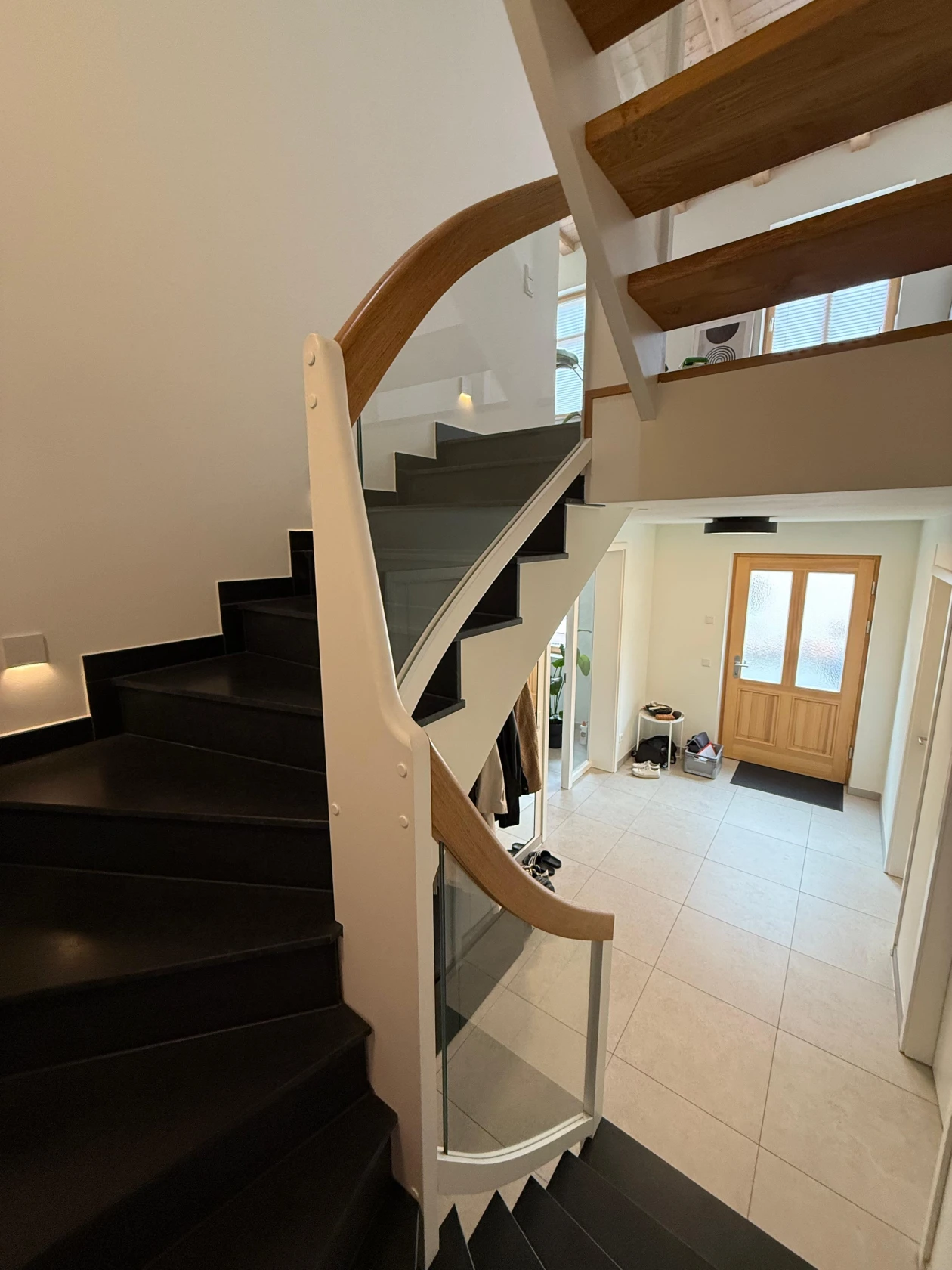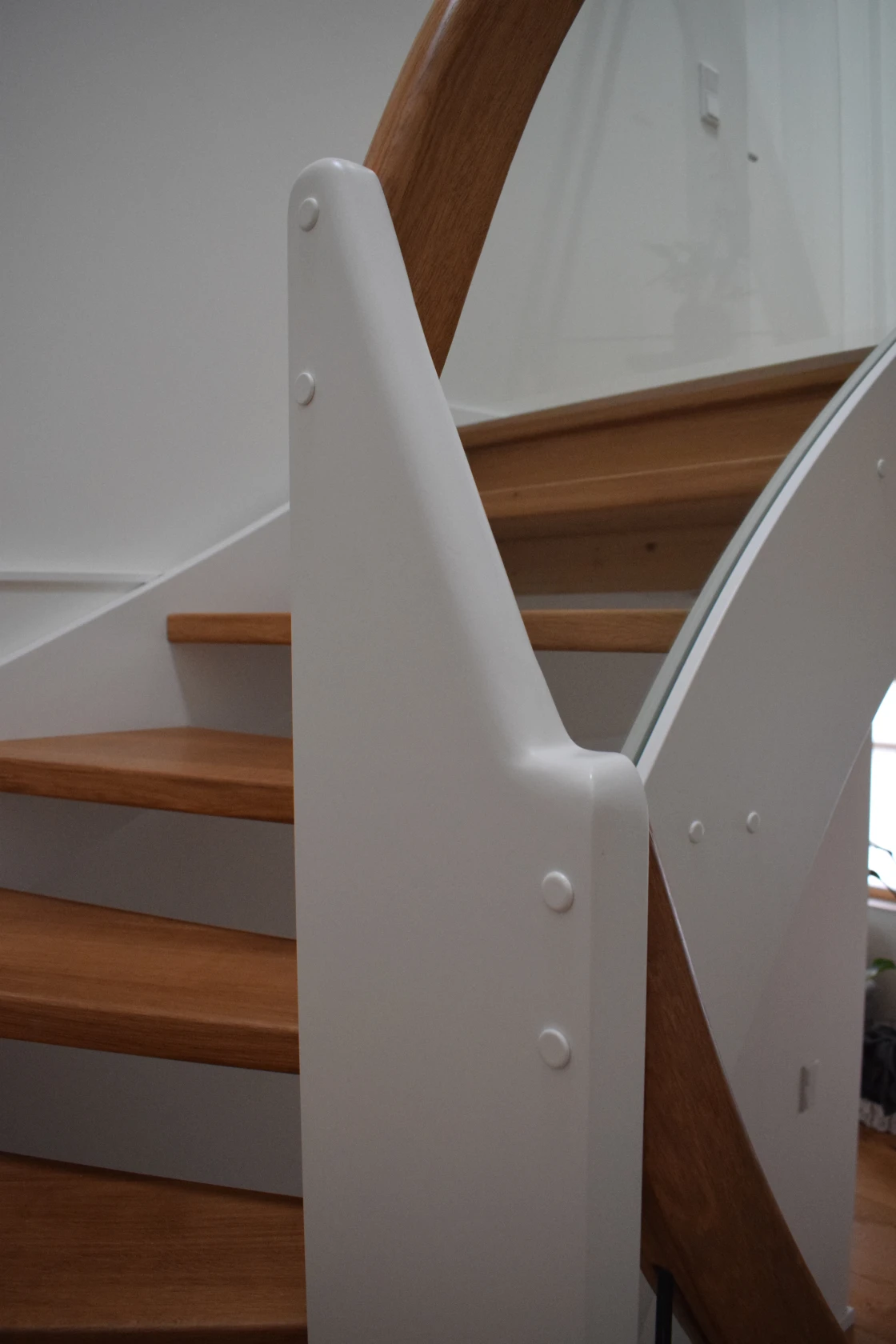 Diese klassische Treppe aus lackierter Eiche überzeugt durch ihre ruhige, ausgewogene Gestaltung und eine sorgfältige Abstimmung auf den bestehenden Wohnraum. Stufen, Geländer und tragende Elemente sind konsequent in Eiche ausgeführt und bilden gemeinsam mit den integrierten Glaselementen ein harmonisches Gesamtbild. Ziel der Planung war es, die Treppe nicht als Fremdkörper wirken zu lassen, sondern sie gestalterisch eng mit dem vorhandenen Parkett und der Farbwelt des Raumes zu verzahnen.