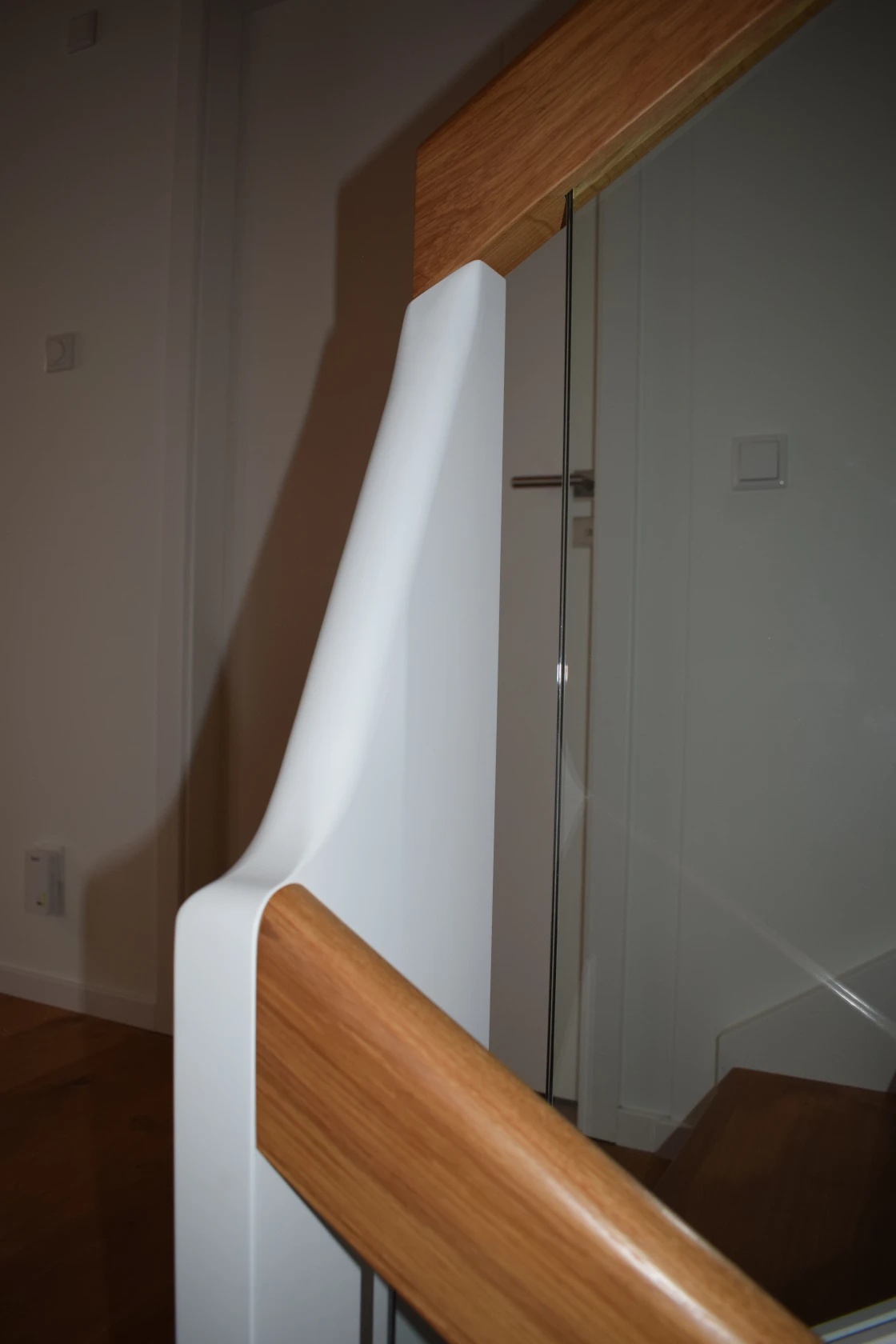 Die Oberfläche der Eiche wurde farblich exakt angepasst, wofür mehrere Bemusterungs- und Abstimmungsrunden notwendig waren. So konnte der gewünschte Ton zwischen Holz, Boden und Umgebung präzise getroffen werden. Die Glaselemente verleihen der Treppe zusätzliche Leichtigkeit und fördern den Lichteinfall, ohne die klassische Grundanmutung zu beeinträchtigen. Das Ergebnis ist eine zeitlose Treppenlösung, die handwerkliche Sorgfalt und gestalterische Sensibilität sichtbar vereint.