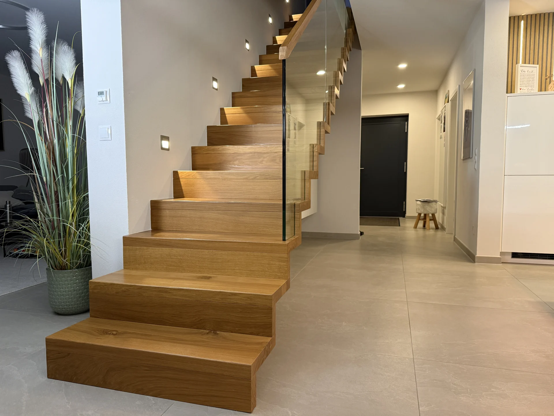 Diese Designtreppe aus geölter Eiche wurde als bewusst leichte Flurtreppe konzipiert und fügt sich harmonisch in den offenen Eingangsbereich ein. Die helle Eiche unterstreicht die freundliche Raumwirkung und verleiht der Konstruktion eine natürliche Wärme, ohne dominant zu wirken. Glasflächen und integrierte LED-Elemente unterstützen die transparente Gestaltung und sorgen für eine dezente, funktionale Beleuchtung entlang des Treppenverlaufs. Eine zentrale planerische Aufgabe bestand in der exakten Abstimmung des Treppenverlaufs auf den Flurdurchgang, um klare Wegeführung und ausreichende Bewegungsfreiheit sicherzustellen. Durch eine sorgfältige bauliche Vorplanung und die kompakte Bauweise konnte die Treppe präzise in die vorhandene Architektur integriert werden. Das Ergebnis ist eine moderne, zurückhaltende Treppenlösung, die Leichtigkeit, Funktionalität und gestalterische Präzision überzeugend vereint.