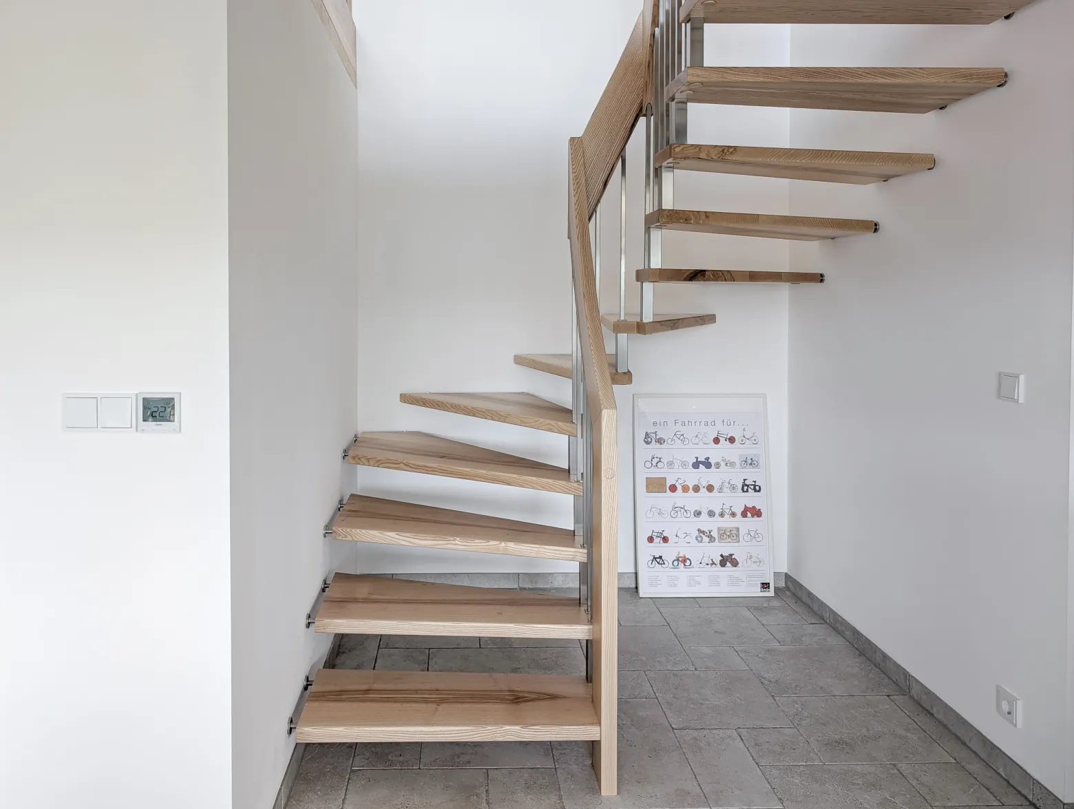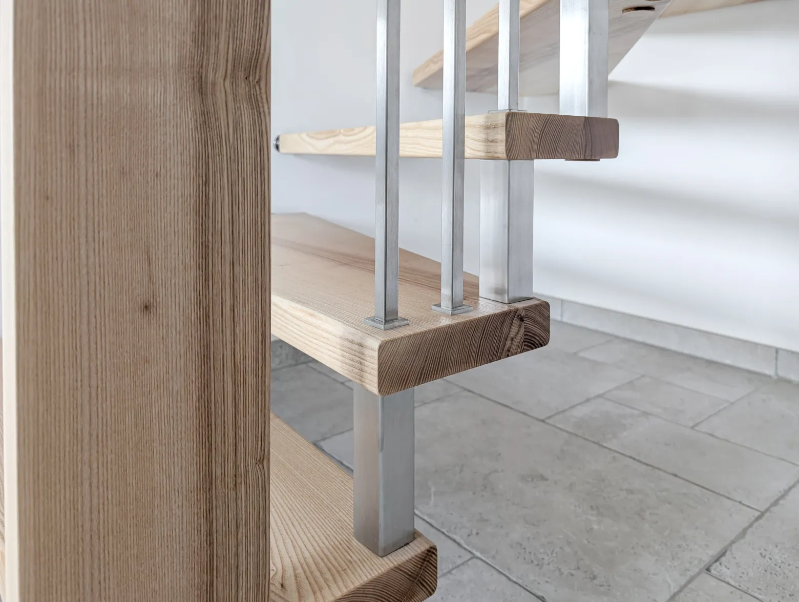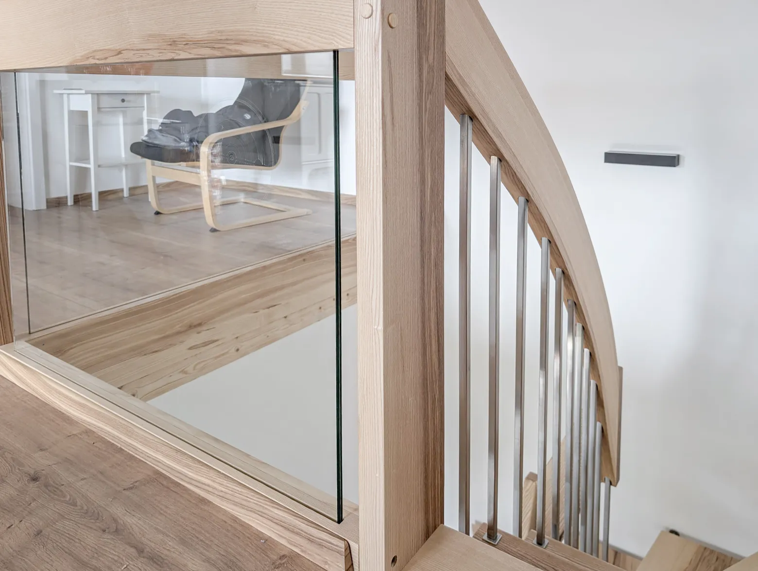 Diese helle, offene Treppenanlage aus massiver Esche überzeugt durch ihre leichte Bauweise und das harmonische Zusammenspiel von Holz, Edelstahl und Glas. Die schwebende Anmutung wird durch die wandseitige Wangenkonstruktion ermöglicht, die die Stufen sicher trägt, ohne die Transparenz zu beeinträchtigen. Das filigrane Geländer aus Edelstahlstäben und glasklaren Elementen verleiht der Treppe einen modernen, luftigen Charakter. Besondere planerische Aufmerksamkeit galt der Einbindung in eine Wandnische mit nicht tragfähigen Wänden – gelöst durch eine tragende Handlaufkonstruktion, die sowohl Stabilität als auch optische Leichtigkeit gewährleistet.