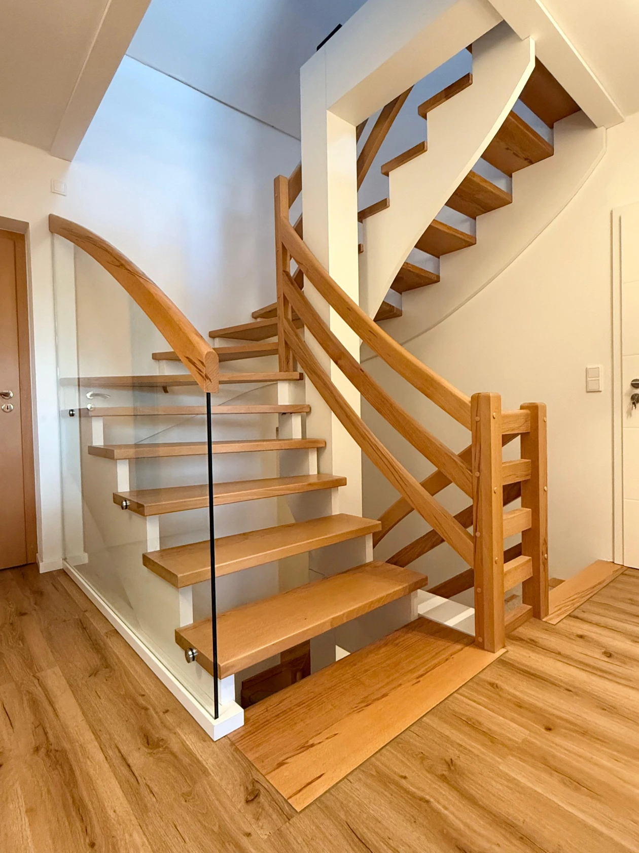 Ein transparenter Raumteiler aus Glas begleitet den Treppenlauf und sorgt für Sicherheit, ohne Licht und Blickbeziehungen einzuschränken. Die Integration einer dezenten LED-Beleuchtung unterstützt die Stufenkonturen und verbessert die Orientierung im Treppenraum. So entsteht eine ausgewogene Verbindung aus handwerklicher Präzision, konstruktiver Klarheit und einer angenehmen, wohnlichen Atmosphäre, die den Raum nachhaltig aufwertet.