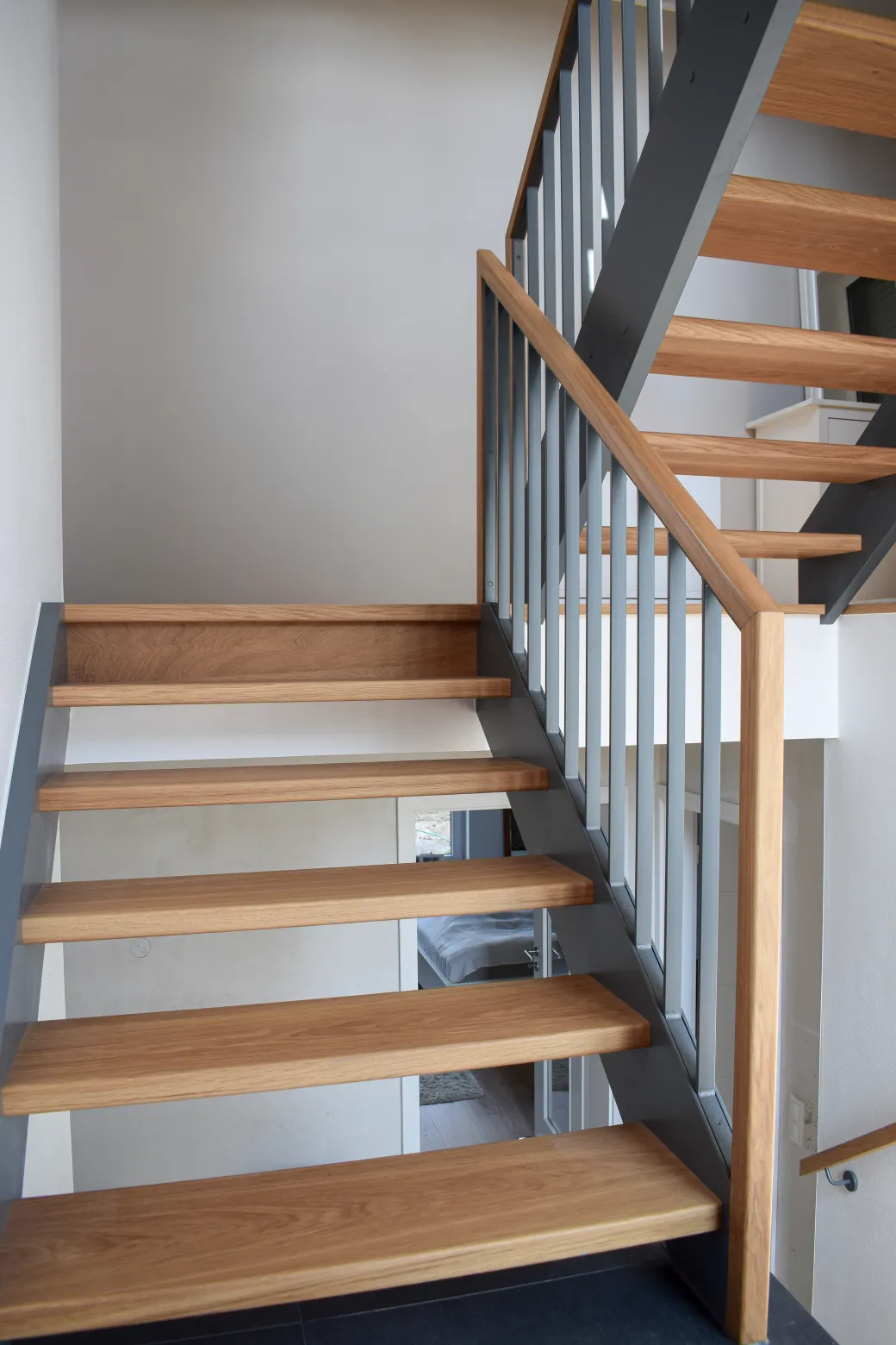 Diese moderne Design-Metalltreppe kombiniert zeitlose Eleganz mit funktionaler Raffinesse. Die massiven Eichenstufen harmonieren perfekt mit dem schlanken Metallstabgeländer und den deckend lackierten Wangen. Ein integrierter Raumteiler verleiht der Konstruktion zusätzliche Struktur und schafft fließende Übergänge zwischen den Wohnbereichen. Durch die besondere verschachtelte Etagenbauweise des Hauses waren präzise Entwurfsabstimmungen, millimetergenaues Aufmaß und eine passgenaue Metallbauplanung entscheidend für die gelungene Umsetzung. Das Ergebnis ist eine hochwertige, langlebige Treppenlösung, die modernes Design und handwerkliche Präzision vereint.