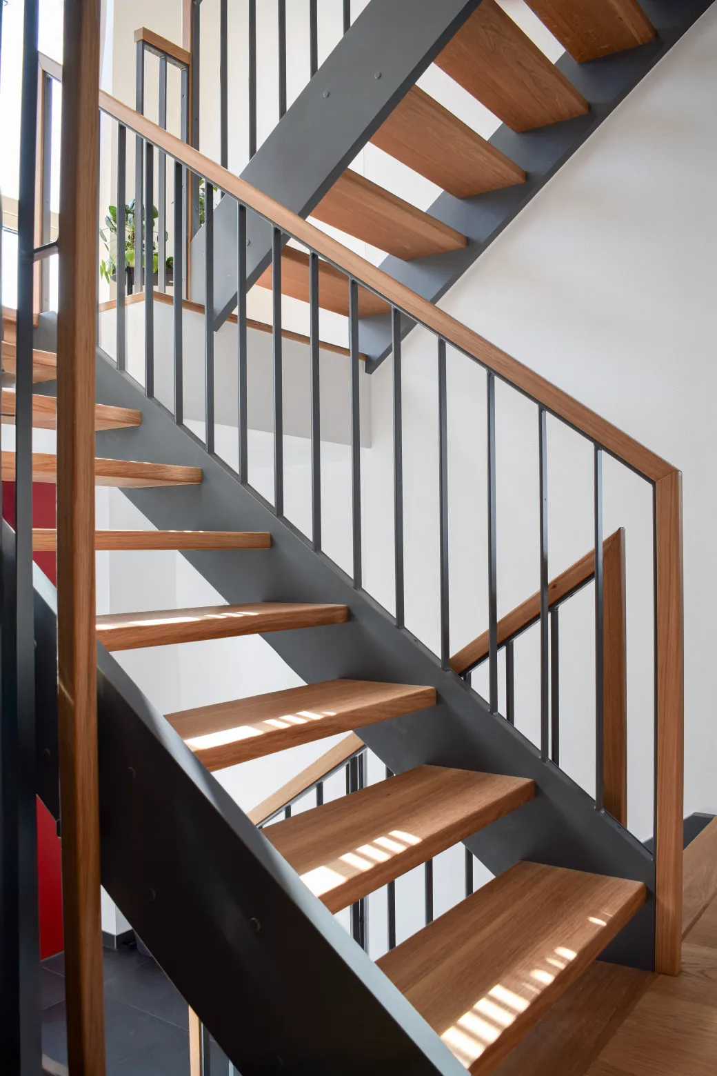 Moderne Design – Metalltreppe mit Eichenstufen und Raumteiler