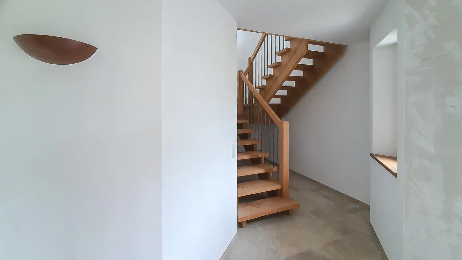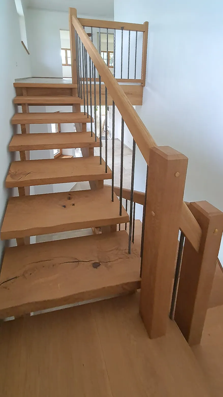 Diese charaktervolle Podesttreppe verbindet massive, rustikale Eichenstufen mit einer naturbelassenen Baumkante und markanten, handgehämmerten Metallstäben im Geländer. Die massiven Eichenwangen unterstreichen den robusten und zugleich edlen Charakter der Treppe. Eine besondere Herausforderung stellte die fugenfreie Verarbeitung des vom Kunden bereitgestellten Materials dar – präzise Holzauswahl und handwerklich exakte Bearbeitung sorgten hier für ein perfektes Ergebnis. Auch die schwierige Befestigung an einer Wand mit anspruchsvollem Untergrund wurde durch ein stabiles Wandlager gekonnt gelöst. Das Ergebnis ist eine langlebige, authentische Treppe, die Wärme, Handwerk und Stil harmonisch vereint.