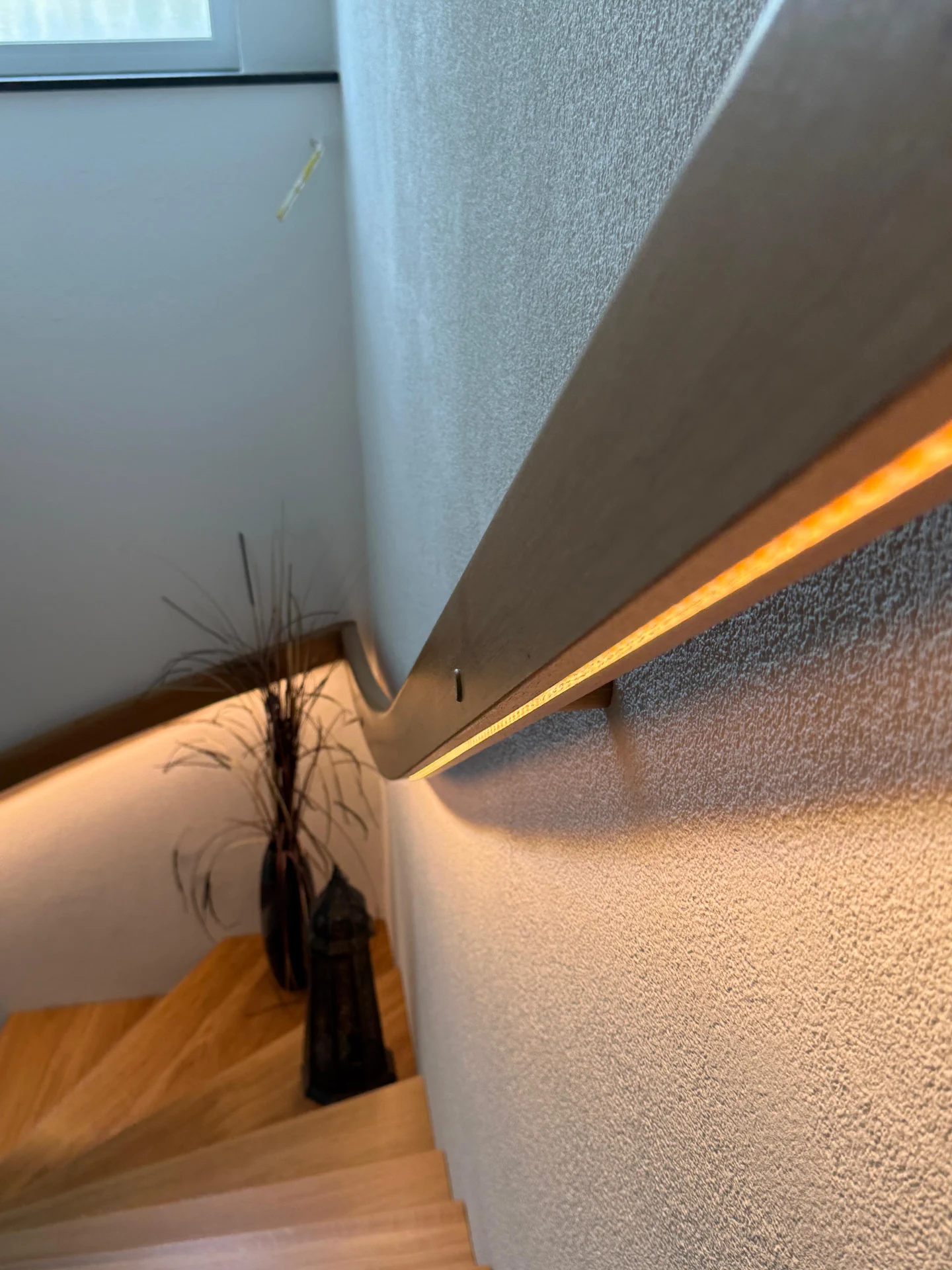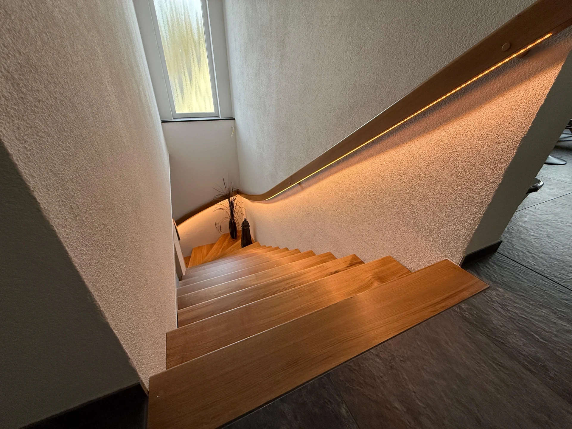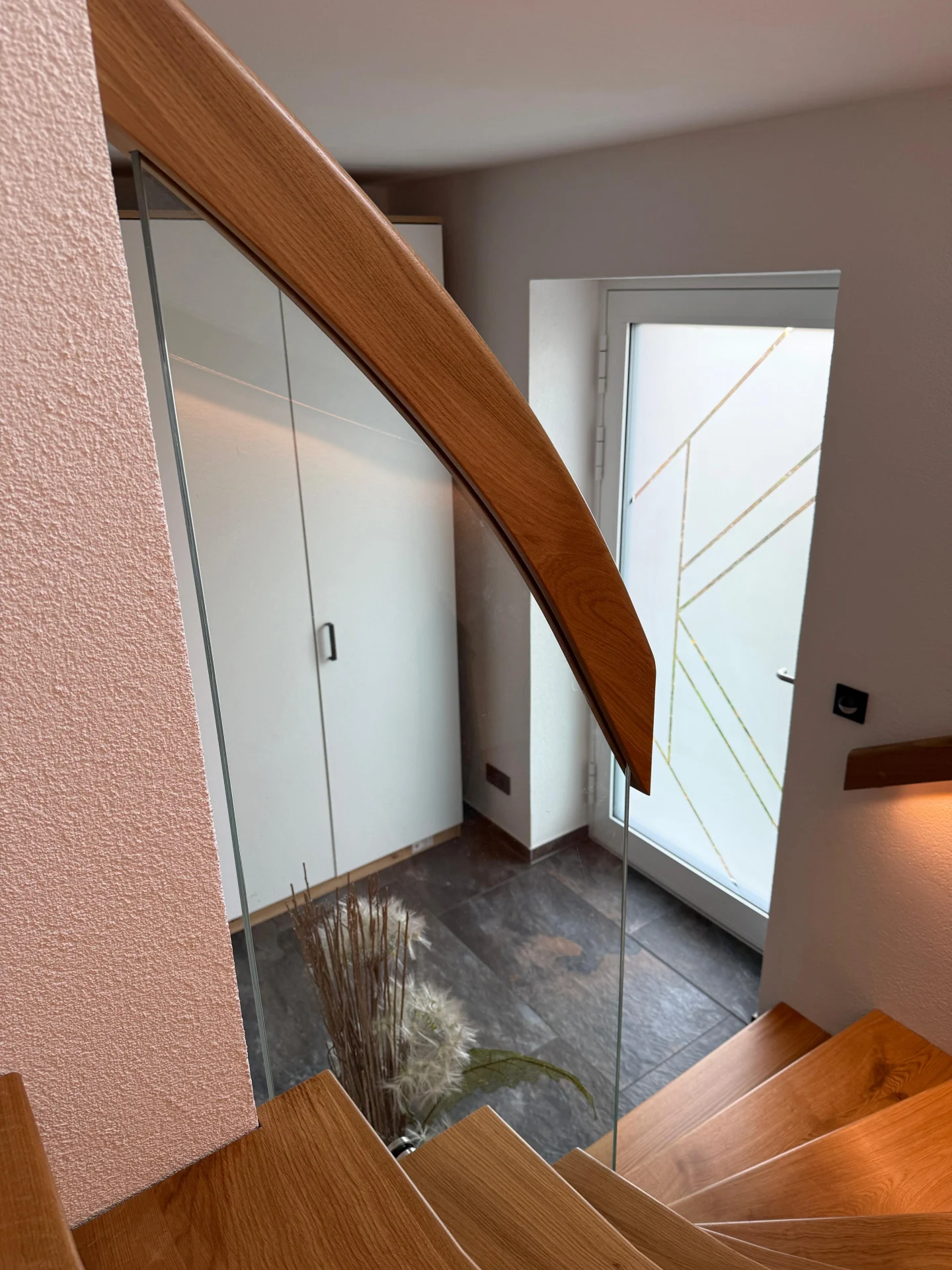 Diese klassische Treppe verbindet traditionelle Formensprache mit zeitgemäßer Detailausarbeitung. Die lackierte Esche verleiht den Stufen eine ruhige, gleichmäßige Oberfläche und unterstreicht den hochwertigen Charakter der Konstruktion. Besonderes Augenmerk lag auf der Nutzung der bestehenden Wandabstufung, die präzise in den Treppenbelag integriert wurde und so eine harmonische Verbindung zwischen Architektur und Treppe schafft. Die Glasbrüstung sorgt für Offenheit und lässt das Treppenhaus großzügig wirken, während die integrierte Beleuchtung den Verlauf der Treppe dezent akzentuiert und Orientierung bietet. Für die passgenaue Umsetzung war ein exaktes Aufmaß mittels 3D-System unerlässlich, da sowohl die Wandgeometrie als auch die Glasdetails höchste Genauigkeit erforderten. Die aufwendige Montage führte schließlich zu einer stimmigen Gesamtlösung, die Funktionalität, Raumwirkung und handwerkliche Präzision vereint.