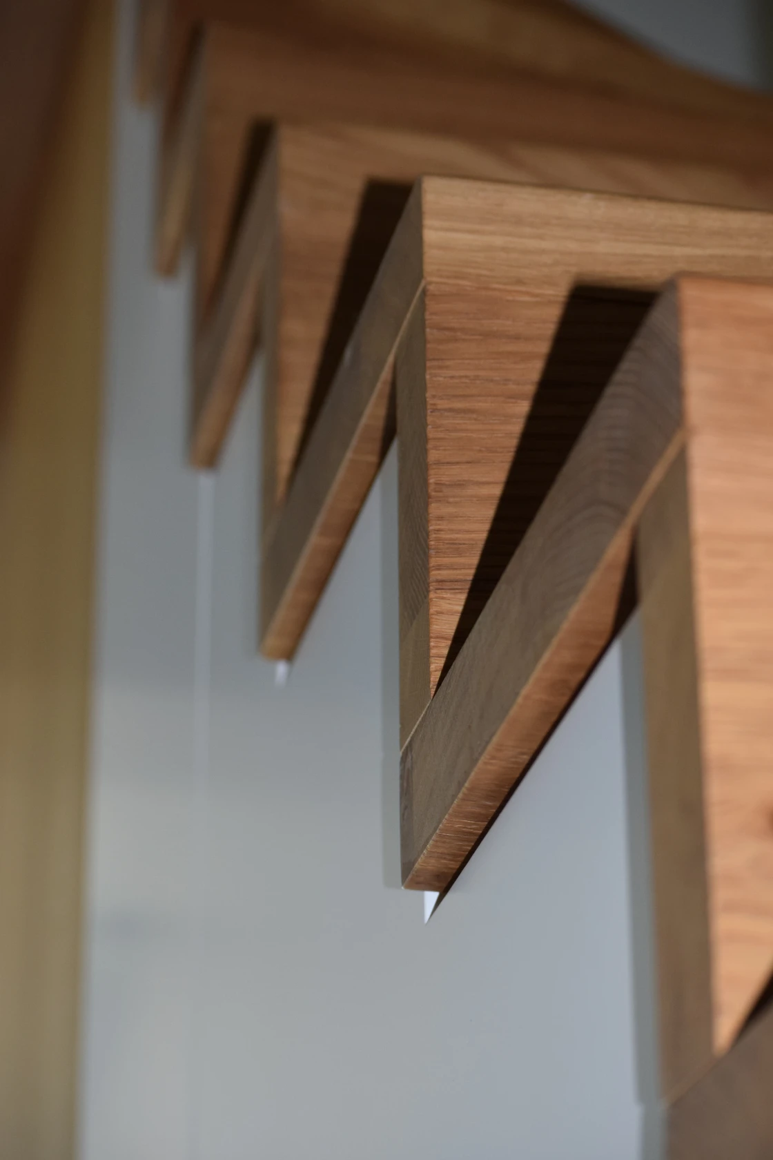 Diese Faltwerktreppe aus geölter und gebürsteter Eiche wurde als prägendes Gestaltungselement bewusst in den Wohnraum integriert. Ziel der Planung war es, die Treppe nicht nur als funktionale Erschließung zu verstehen, sondern sie aktiv in die Raumstruktur einzubinden und gleichzeitig eine klare Abgrenzung zum Flur zu ermöglichen. Die warmen Eichenstufen stehen in einem spannungsvollen Kontrast zum klar gezeichneten Metallgeländer und verleihen der Konstruktion eine moderne, zugleich wohnliche Ausstrahlung.