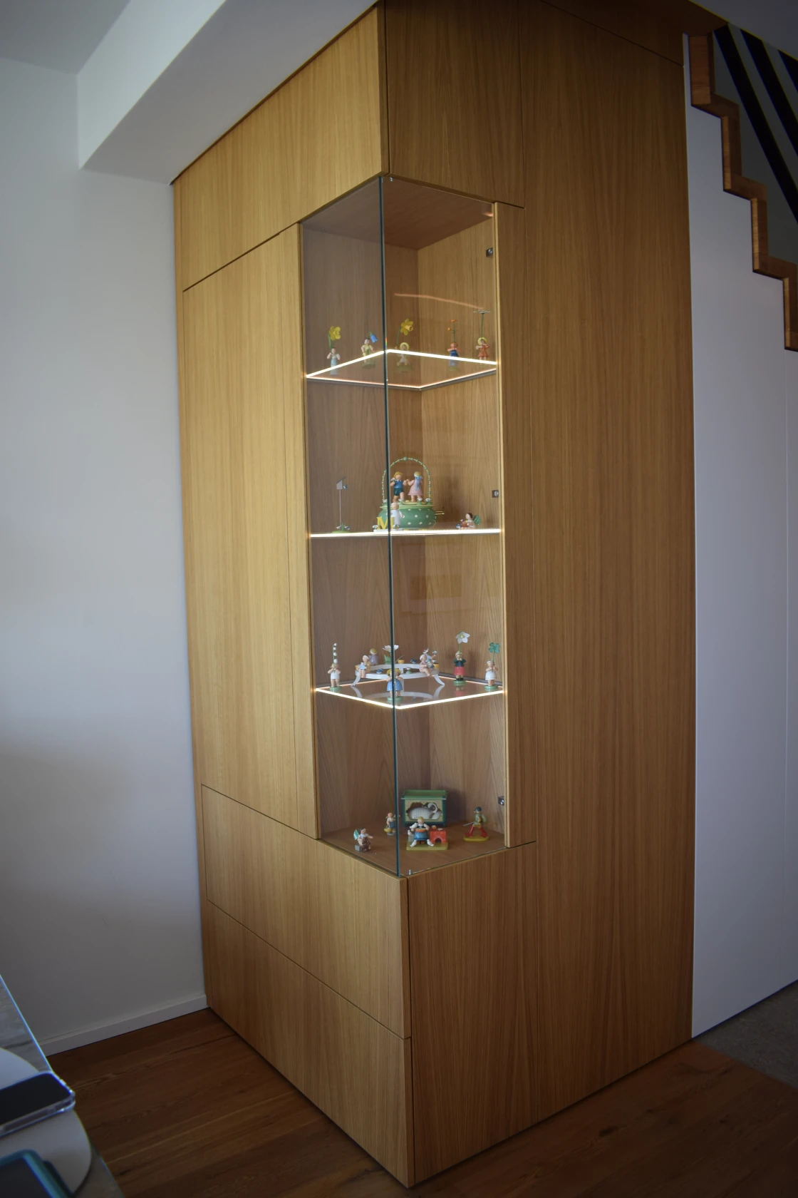 Unter dem Treppenlauf entstand ein maßgefertigter Schrank, der sich zum Wohnraum öffnet und zusätzlichen Stauraum bietet. Eine integrierte Trenntür ermöglicht die flexible Abtrennung des Flurbereichs, ohne die Offenheit der Gesamtgestaltung zu beeinträchtigen. Die dezent eingesetzte LED-Beleuchtung betont die Faltwerkgeometrie der Stufen und unterstützt die räumliche Tiefe. So verbindet diese Treppenanlage Möbelbau, Raumplanung und handwerkliche Präzision zu einer klar strukturierten und atmosphärischen Wohnlösung.